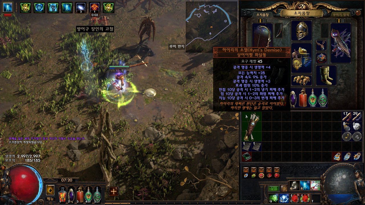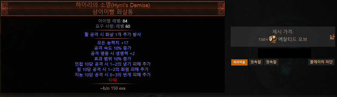 우선 하이리의 소멸은 토샷(회오리샷) 빌드에서 아주 많이 사용되고 있고 커럽을통한 화살 1발 추가 및 연쇄 옵션이 붙으면 가격이 어마어마하게
