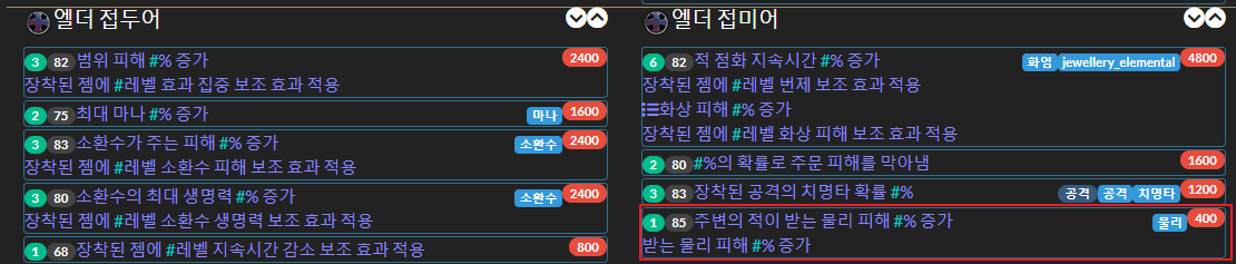 적당한 생명력과 최대 생명력 %, 주변의 적이 받는 물리 피해 9%증가 옵션이 나왔네요
