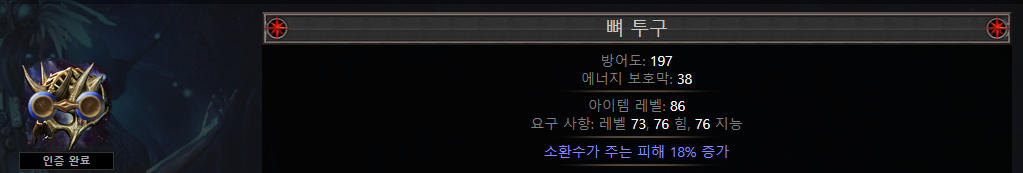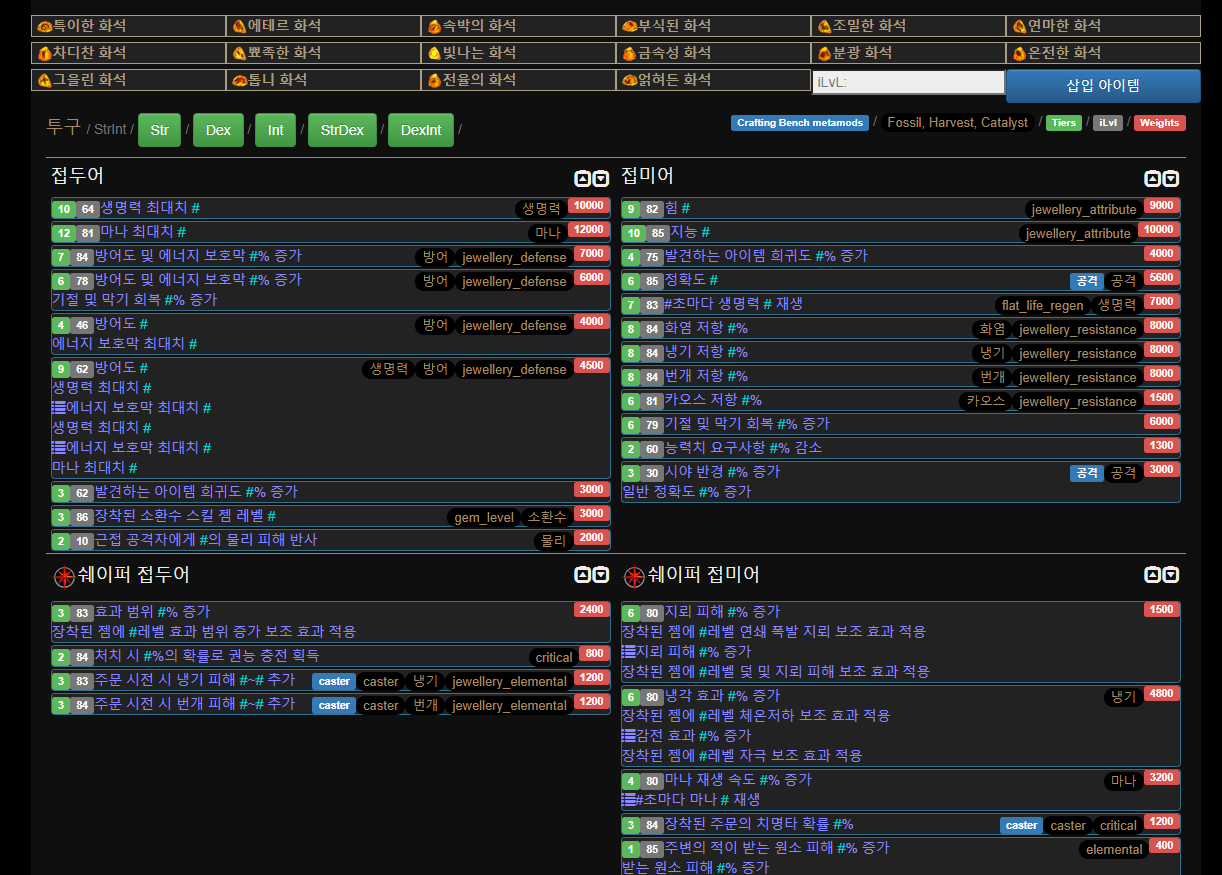 접두어에 붙여놓은 옵션을 지워주고 생명력 부여 수확크래프팅을 통해 생명력 + 붙여 줍니다. 남은 접미어 한자리에 부족한 저항이나 능력치 등 필요에 맞에 붙여 사용하면 뼈투구 제작은 마무리가 됩니다.