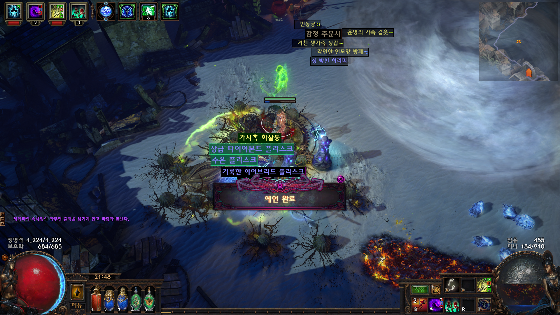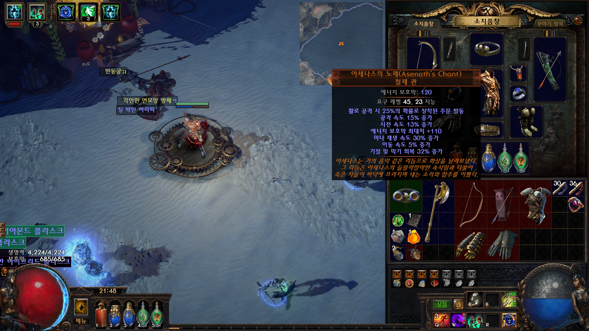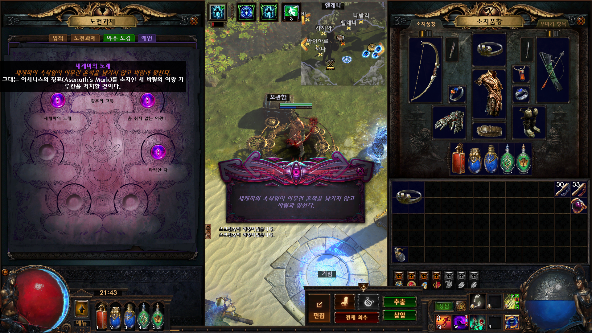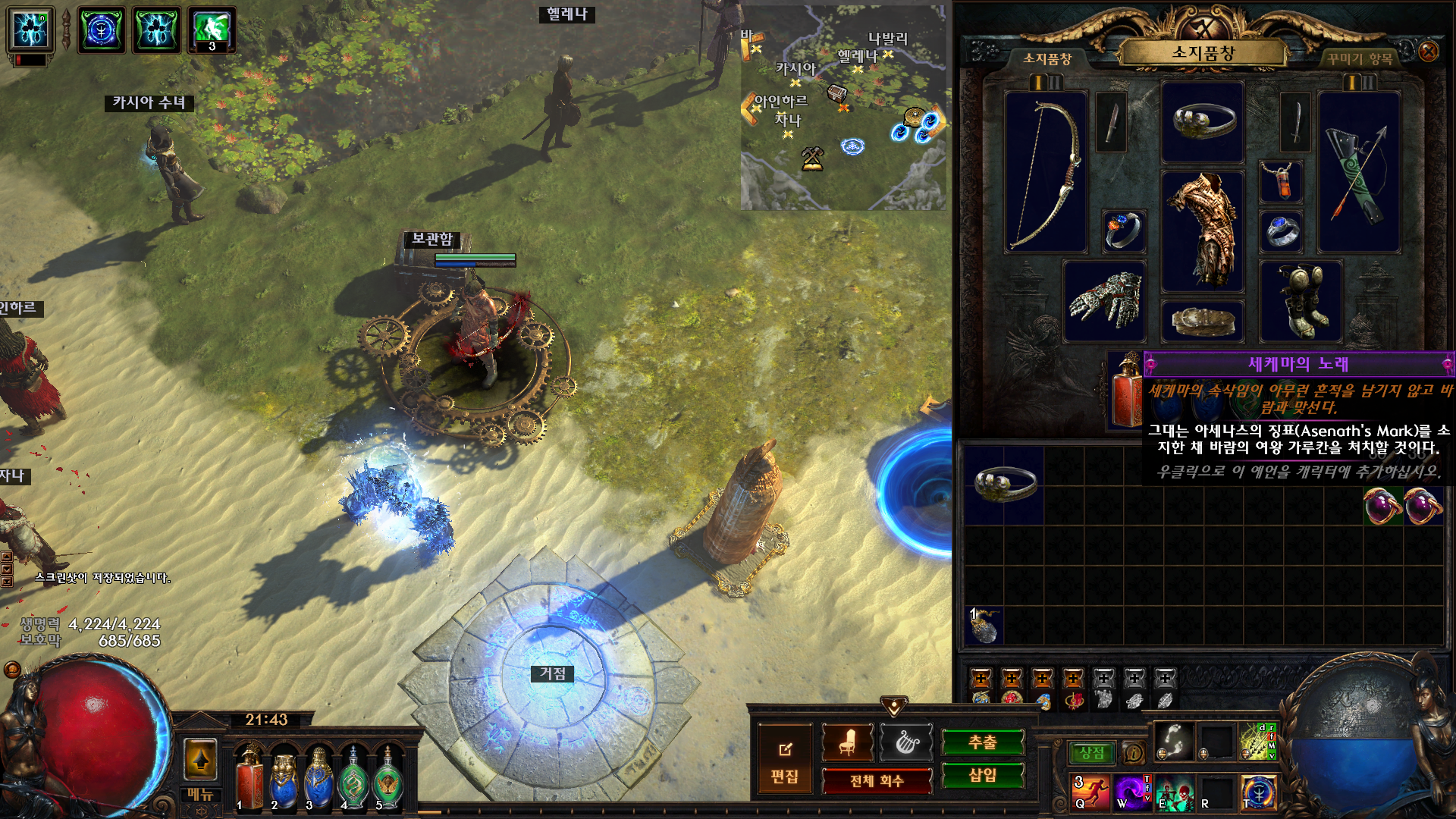 우선 예언을 활성화 시키고 마우스 우측 클릭을 하면 예언 활성 완료 인벤에 아세나스의 징표(철제관)을 가지고 있는 상태로 9장 채석장 바람의 성소에 있는 바람의여왕 가루칸을 잡으면 예언 완료와 동시에 아세나스의 노래로 업그레이드 완료