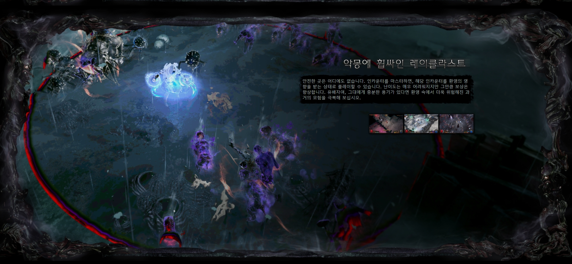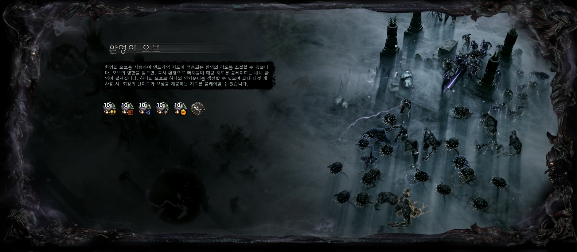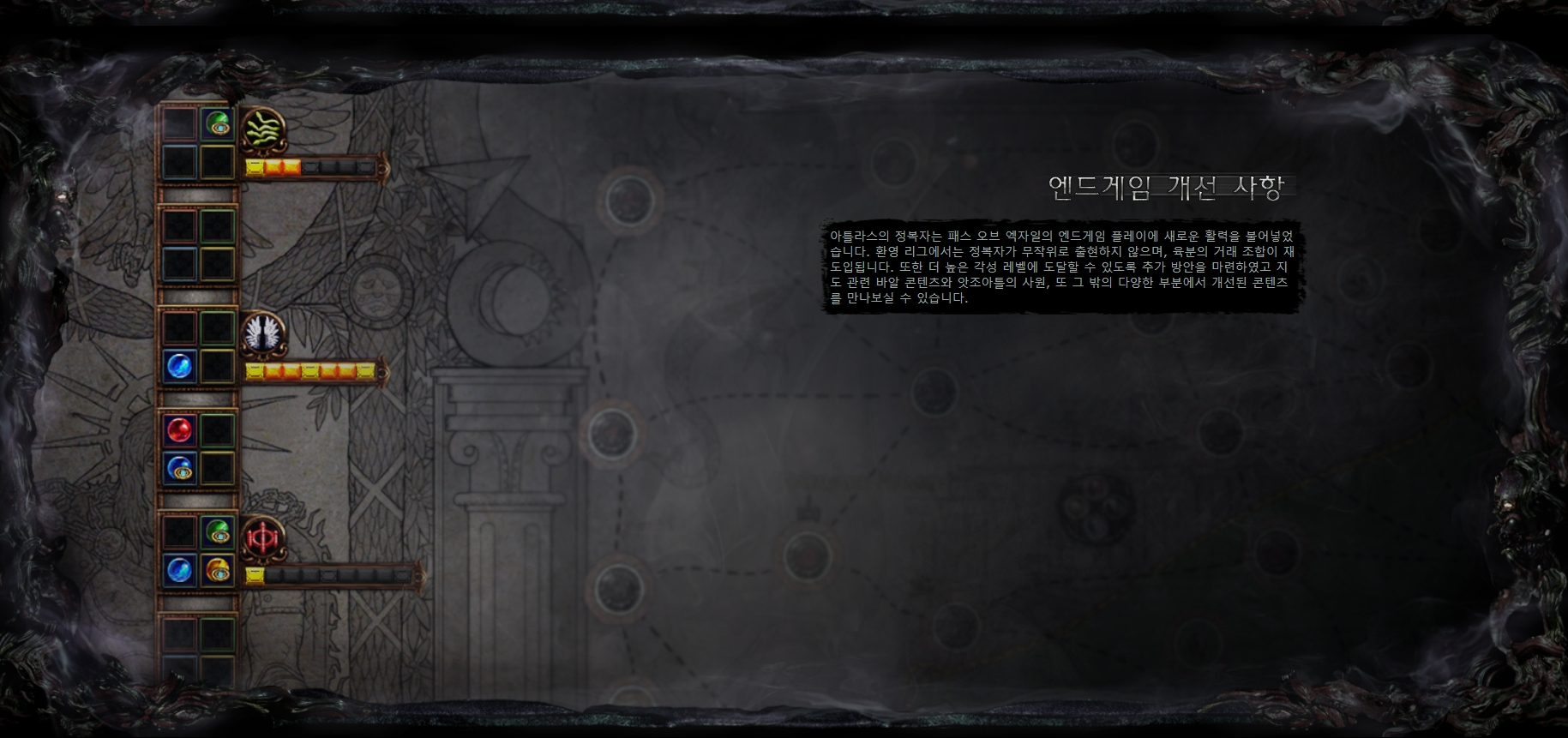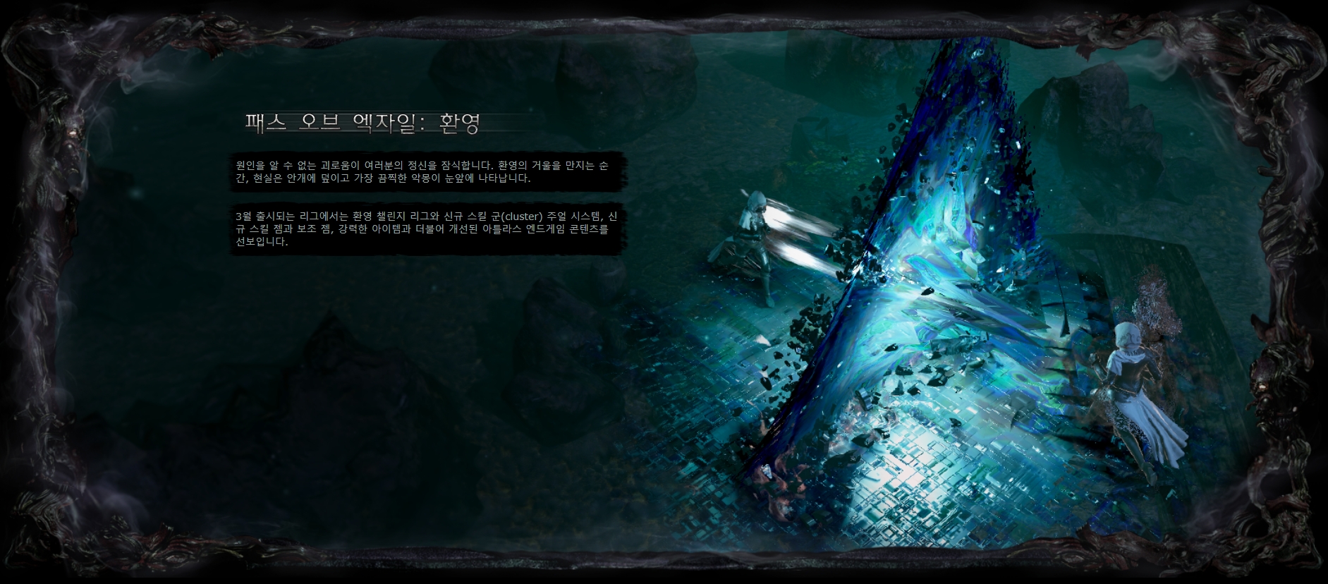 - 맵에 환영의 거울이 나타난다. 거울을 통과 하면 맵 전체가 안개에 휩싸여 새로운 몬스터가 나타난다. 안개가 사라지기 전까지 몬스터를 최대한 많이 잡아 보상을 늘리는 형식 패시브 트리에 새로운 노드를 추가하는 신규 군주얼이 추가 되었습니다.