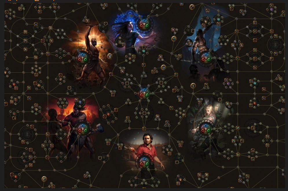 하나의 광범위한 스킬트리 선택한 캐릭터에 따라 시작 위치가 달라지는 방식으로 가운데 사이온 시작점을 중심으로 육각형 모양으로 분산되어 있다.