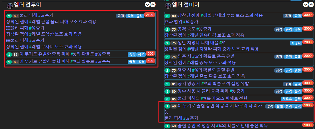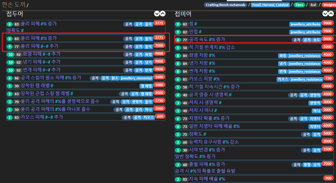 일반 접두 옵션으로는 물리피해 %, 물리피해 #~# 엘더 접두어에 있는 출혈 증폭, 물리피해%+스킬보조 하이브리드 옵션을 노리고 일반 접미옵션에서는 공격속도, 엘더 접미어에서 마무리 타격 옵션을 노리고 한자리를 퀄리티 제작대 크래프팅을 해줄 예정입니다.