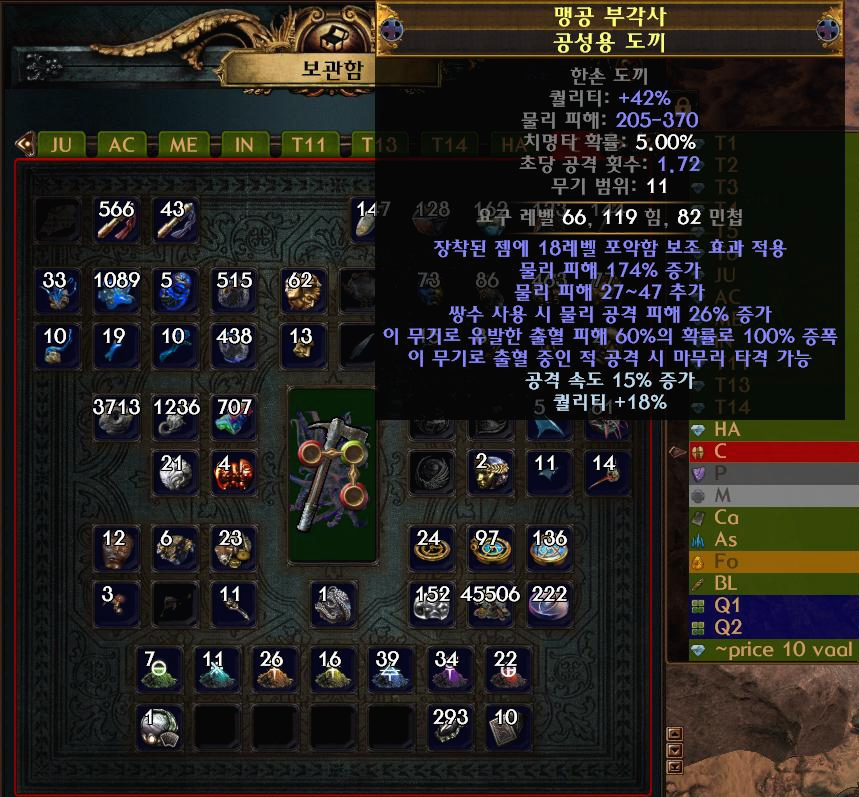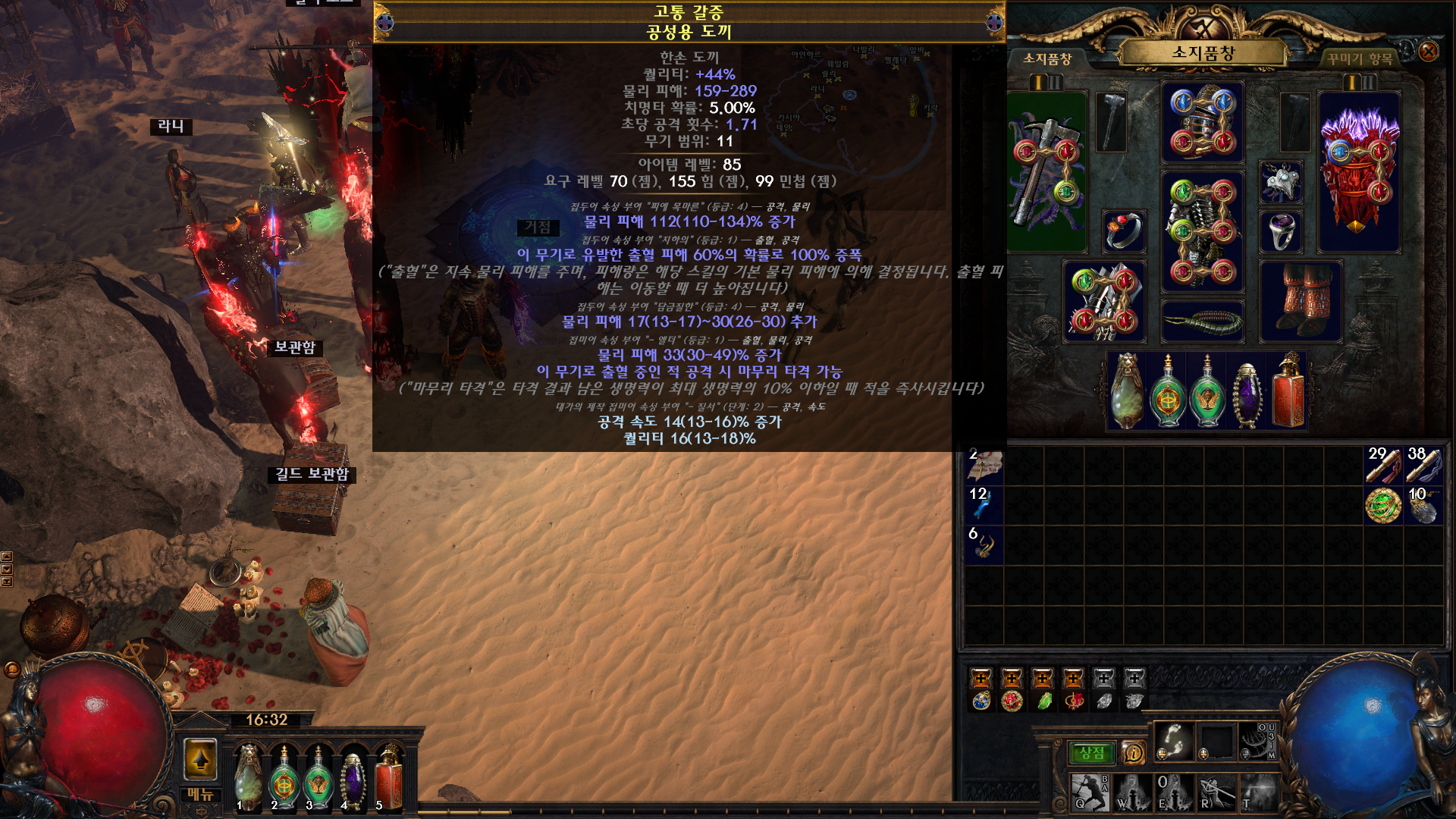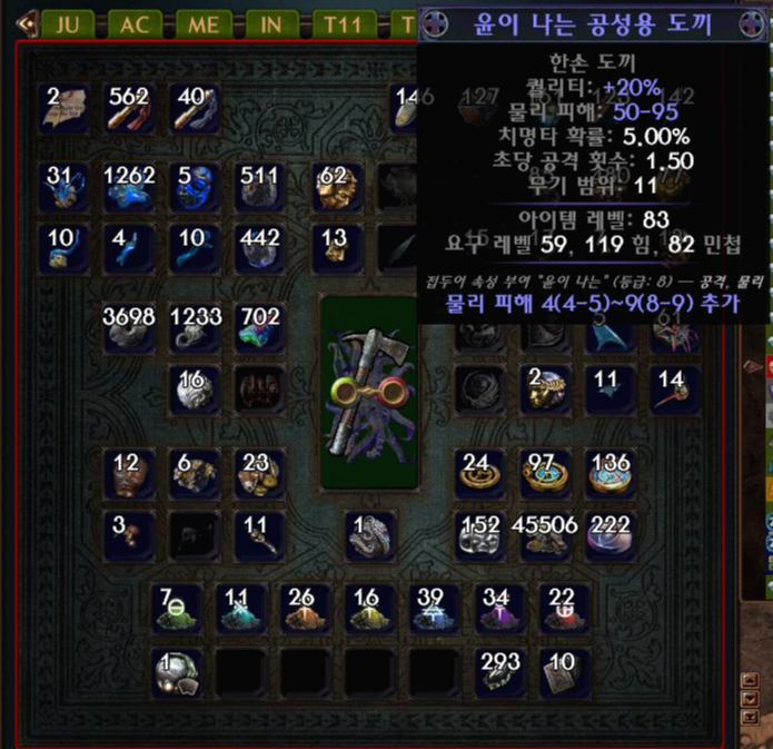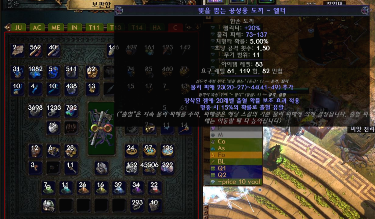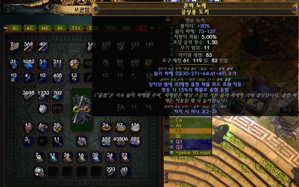 우선 베이스 아이템을 구해야 합니다. 엘더베이스에 출혈 및 중독 옵션이 붙을수 있고 물리 피해 %가 1티어로 붙을수 있는 83짜리 공성용 도끼를 하나 구합니다.
