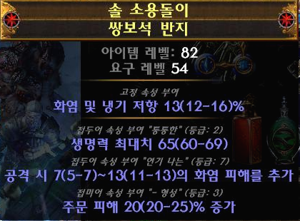 고유 옵션인 화염/냉기저항 이 붙어있는 쌍보석 반지로 준비하였고 현재 옵션은 상관없습니다.