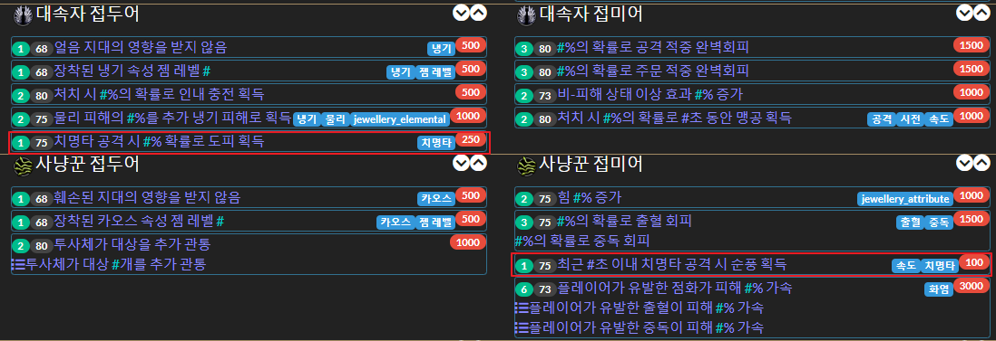 이제 접두어 한자리가 남았고 여기에 치명타 속성 부여를 하면 도피 옵션이 붙습니다.