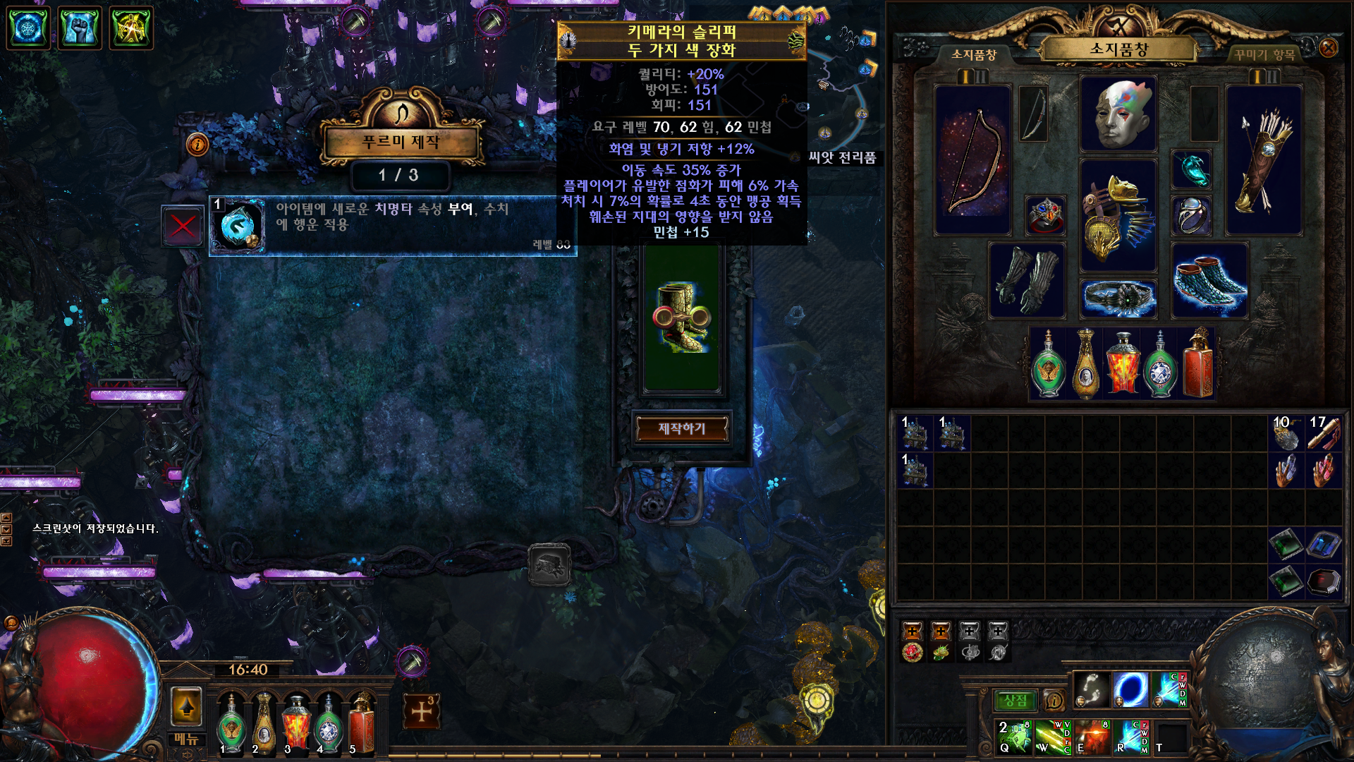 준비물은 아이템렙 86이상 두가지색 장화(이동속도 35가 나오는 렙이 86이상입니다). 사냥꾼 베이스 장화 아무거나