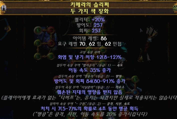 비-방어 제거 후 방어 부여 를 통해서 생명력 최대치를 제거하고 방어 옵션이 붙었습니다 이동속도는 살아 남았네요 비-카오스 제거 후 카오스 부여를 통해서 아이템 희귀도를 제거하고 훼손된 지대 영향을 받지 않음 옵션이 붙었습니다.