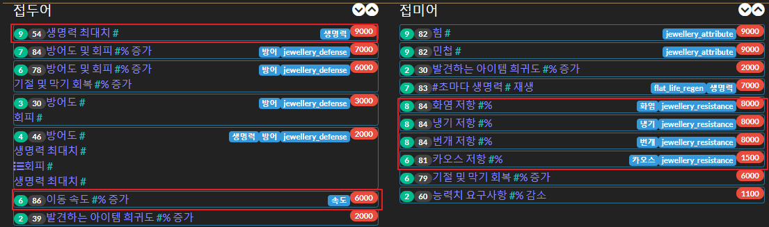 방어 제거를 통해 방어도 및 회피 증가를 제거해주면 접두어에 이동속도 35 및 훼손된 지대 영향 받지 않음 2개가 남습니다.
