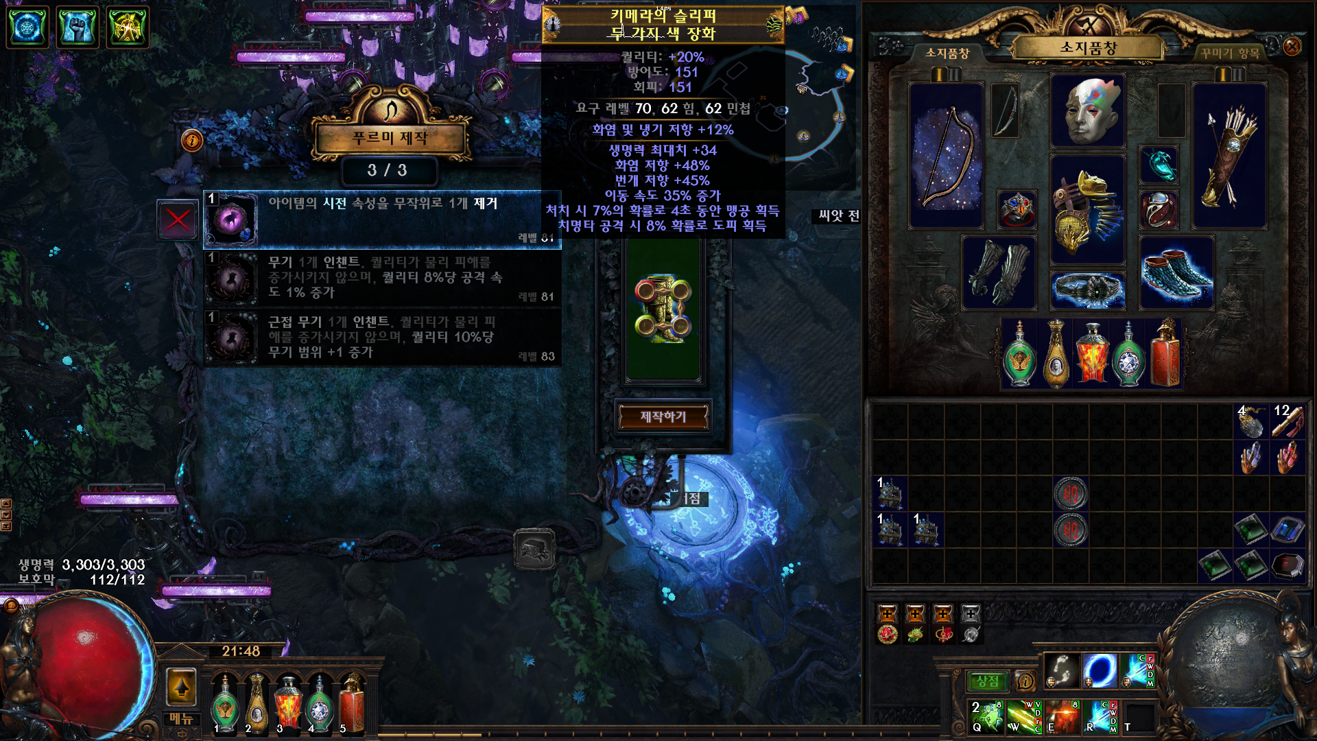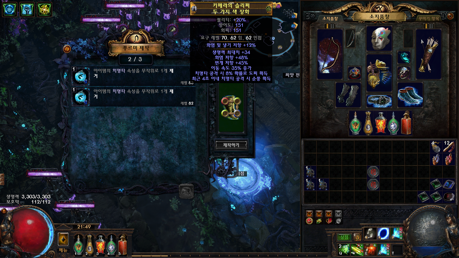 접두어를 마저 작업하기 위해서 카오스 옵션인 훼손된 지대의 영향을 받지 않음을 카오스 제거를 통해 제거해주고 생명력 부여를 통해 생명력 최대치 1티어를 부여해 주면 접두어 3개지 옵션은 완료가 됩니다.